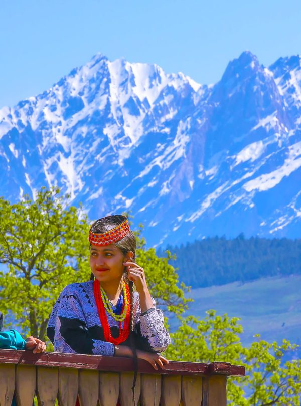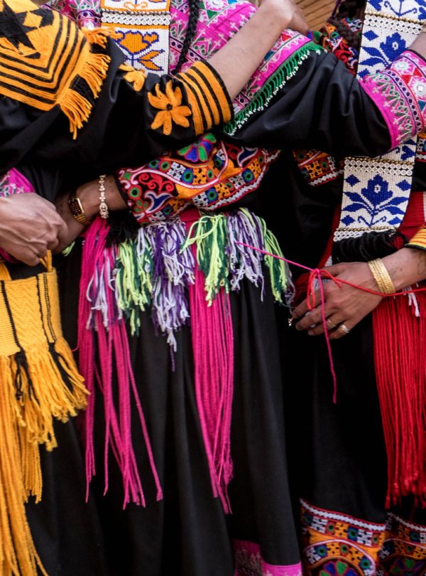 The women wear traditional attire with lively colors and hair dressers have patterns of flowers on it. They wear beaded necklaces which compliments their dresses and head gears. Men wear traditional Shalwar Kameez with a waistcoat made of wool.